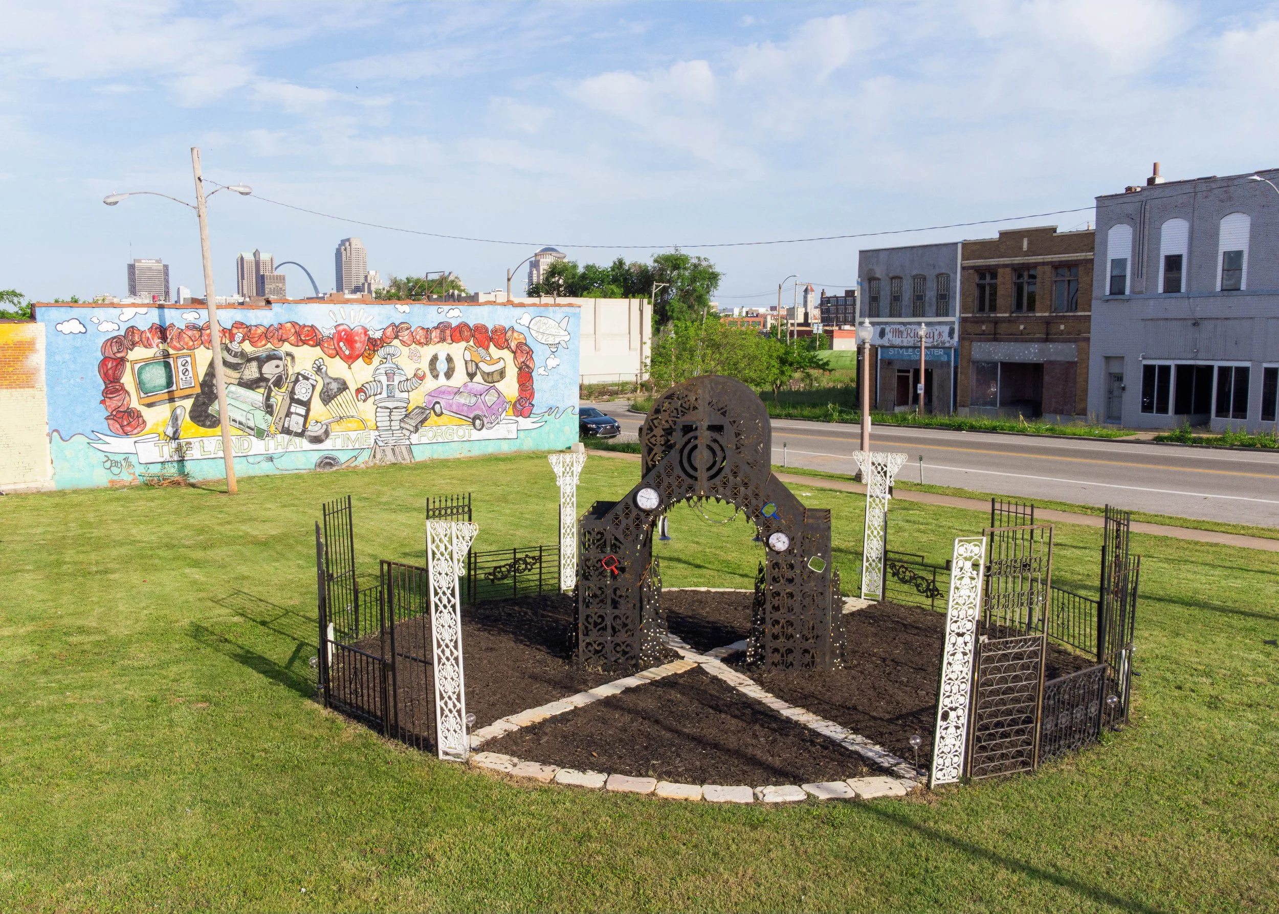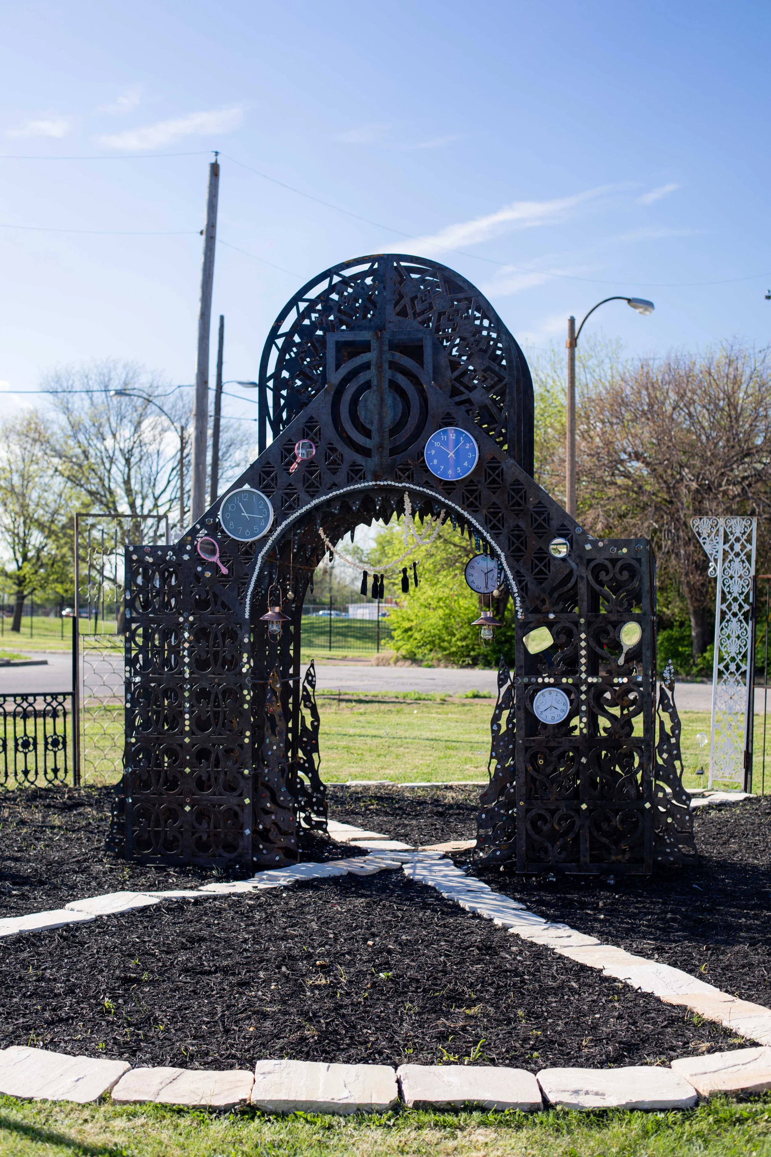 SLOWER-THAN-LIGHT SHRINE: IN REMEMBRANCE OF THE UNDERGROUND RAILROAD is a public monument and portal paying homage to liberation seekers who traversed the Underground Railroad in St. Louis, using the caves beneath the city on their path. The shrine honors the abolitionist movement and marronage of the Underground Railroad, and the resonance of the issues urgent in the present and relative future(s). The shrine is constructed in the image of a Kongo cosmogram as well as configurations related to quantum physics experiments with gates and archways drawn from demolished homes in St. Louis.